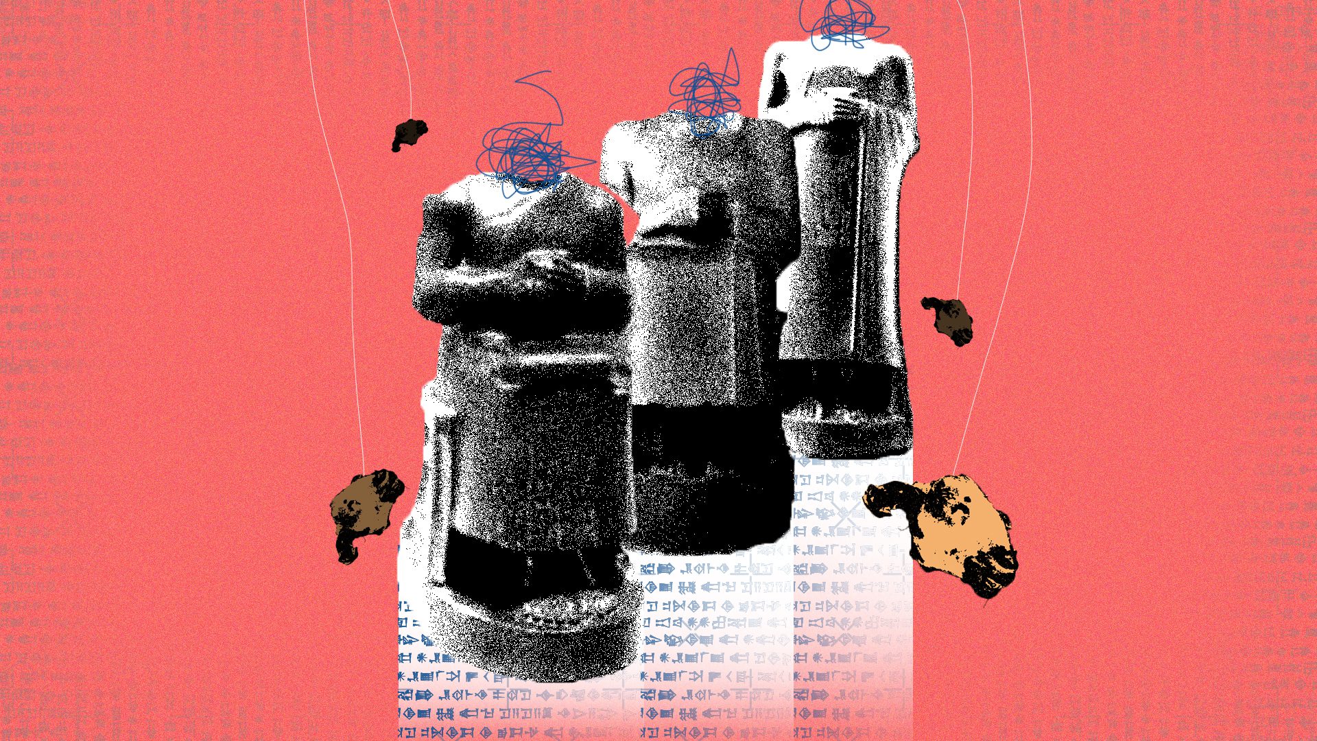 المشكلة الثالثة هي التماثيل نفسها، كأنها تعرضت لعملية ذبح منظمة تحت التراب، هنالك قصص كثيرة يمكن تلفيقها حول هؤلاء الملوك، لكنه يبحث عن قصة صلدة يمكنها أن تصمد أمام مستشاري المتحف وهم يفكرون بكتابة كذبة مناسبة تغري الناس في زيارة المتحف والانبهار بالتماثيل الشرقية الغامضة القادمة تواً من بلاد الرافدين.